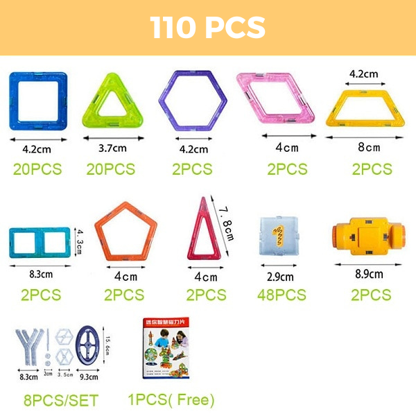 Multiple combinations: With multiple pieces available in sets of 110, 128, 142, and 184, kids can combine the magnetic blocks to create different patterns like Ferris wheels, houses, cars, planes, animals and more. This allows them to experiment with different shapes, colours, and designs.